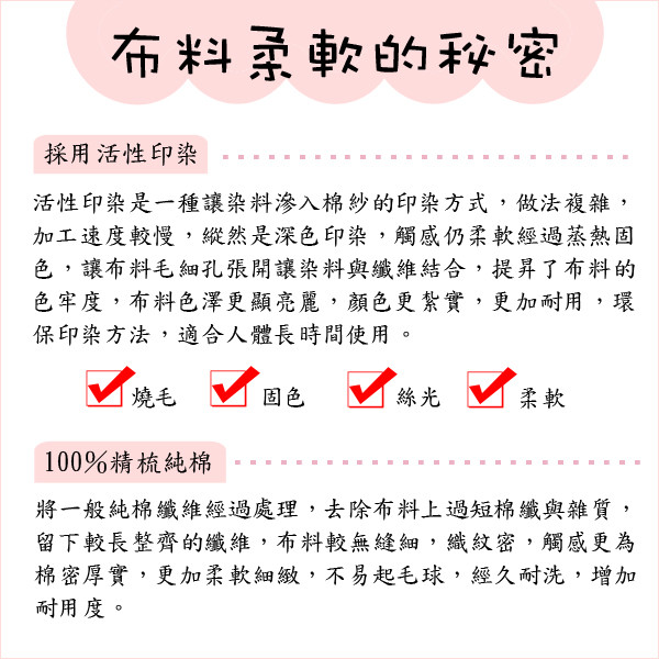 (經水洗、防縮、防皺等多道後處理工法,色澤鮮艷自然經久耐用)