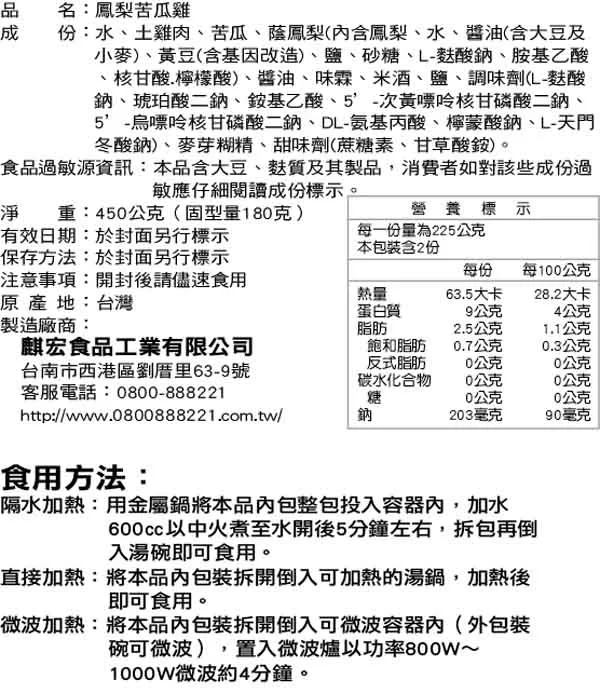 本品保證均採用CAS認證大廠的台灣土雞肉塊,加上合格醬園醃製的豆醬鳳梨、新鮮苦瓜、簡單調味後用先進的殺菌釜以中溫燉煮兼滅菌方式製造,保住所有食材的風味及營養並可以在冷藏條件下較長時間保存,食用時不必等解凍,可立即復熱,快速方便。
